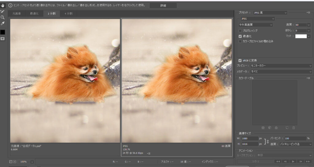 2分割や4分割で元データと書き出しデータの品質チェックができる
