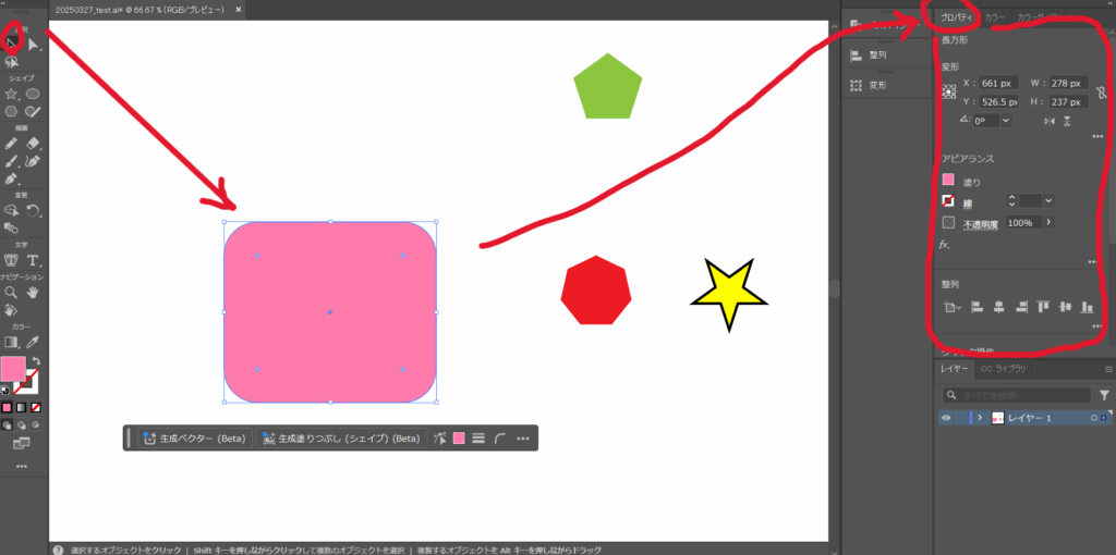 「選択ツール」で編集したいオブジェクトを選択、プロパティタブの項目から編集する。