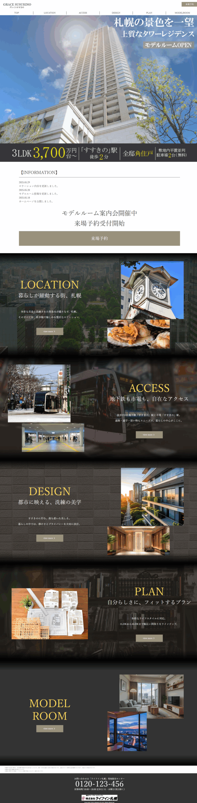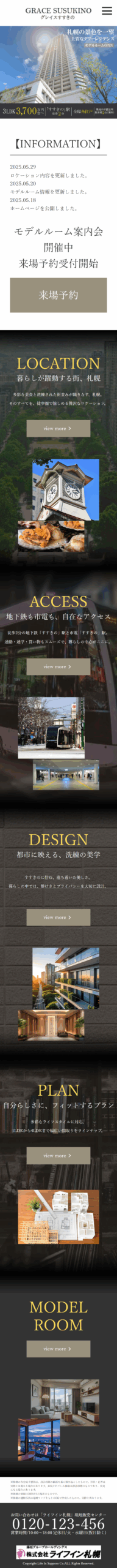 必要情報が一目でわかるTOPページ。札幌の情報から土地自体への価値を理解してもらい、マンションの魅力を伝える構成として、北海道外からの顧客流入も狙う。各セクションは画像をメインとして立地のイメージを想起させる意図を持たせた。